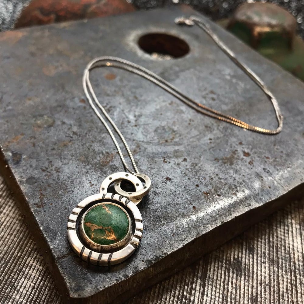 This beautiful little pendant is handmade from sterling silver with a stunning green and bronze Malachite center stone. Etched on the back of the pendant is a mountain scene for those days when you miss the mountains.